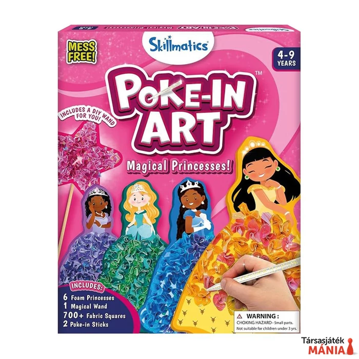 A Poke-In Art egy tű nélküli, kreatív kézműves játék, ahol a gyerekek színes fóliadarabokat nyomhatnak a habszivacs hercegnők ruháiba, így látványos estélyiket alkothatnak, vagy akár saját varázspálcát is készíthetnek.